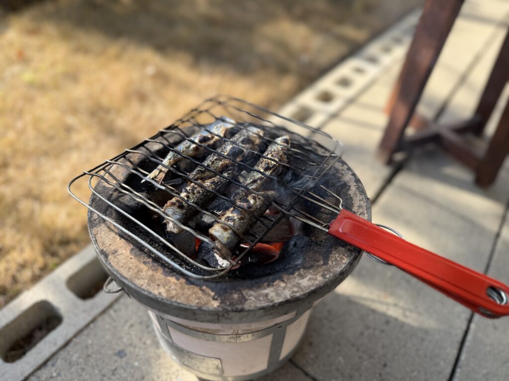 かもしか道具店さんの【炭火コンロ 角】で、金目鯛の干物を焼きました。コンロが小ぶりなので半身にして焼きます。