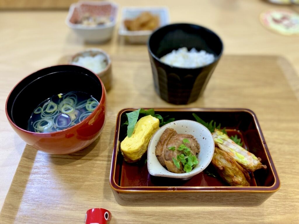 おまけの朝ごはん。鴨の残りと、蓮根と枝豆を混ぜて作った練り天と、卵焼きと、しじみのお吸い物です。鹿児島から知り合いに送って頂いた壺漬けが美味しいです。